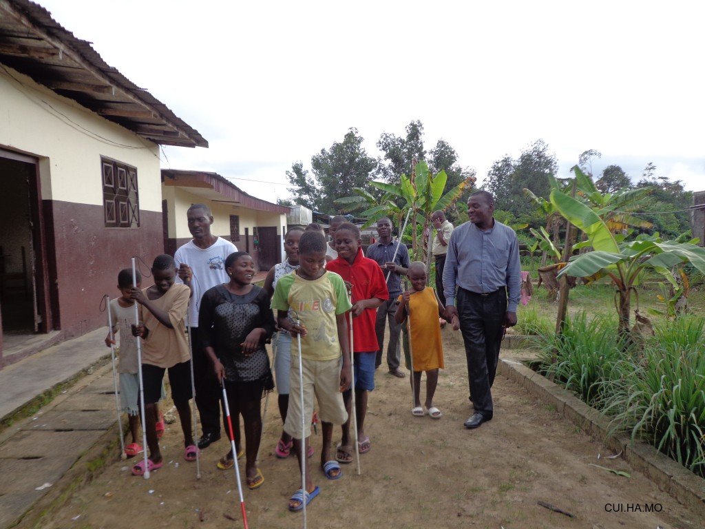 Les aveugles du centre aux côtés de l’Abbé Gabriel, membre CUI.HA.MO.