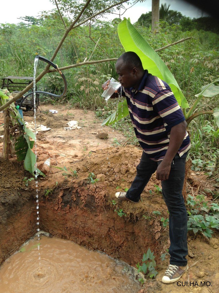 Un membre de l’Association prend sa première gorgée d’eau du nouveau puits